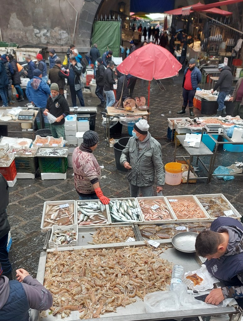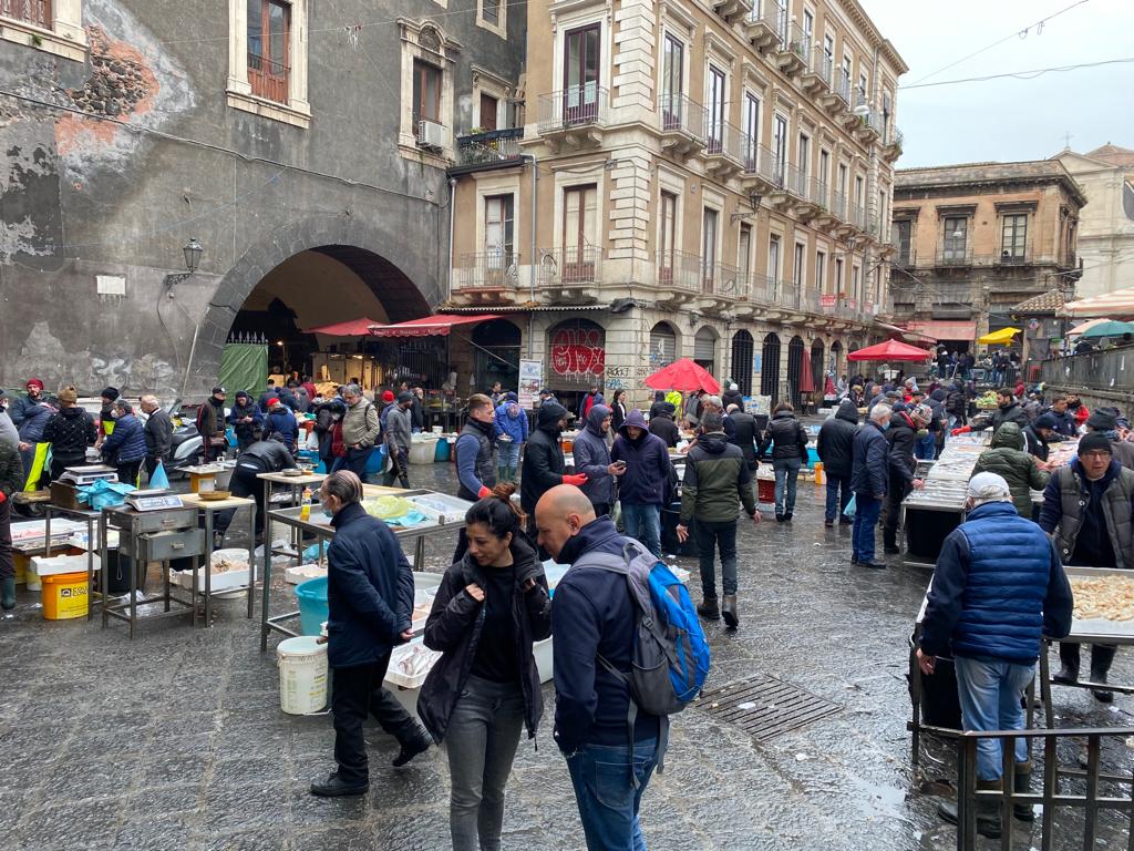 Non potevamo andar via da Catania senza aver visitato la Piscaria. Così l’indomani prima di riprendere il nostro tour ritorniamo in Piazza Duomo. Il vivace brusio, la “vuciata”, quell’insieme disordinato e vivace di parole strillate dai pescatori che si mischia ai rumori di lame dei coltelli che affettano e sgusciano pesce freschissimo era riconoscibile già in lontananza.