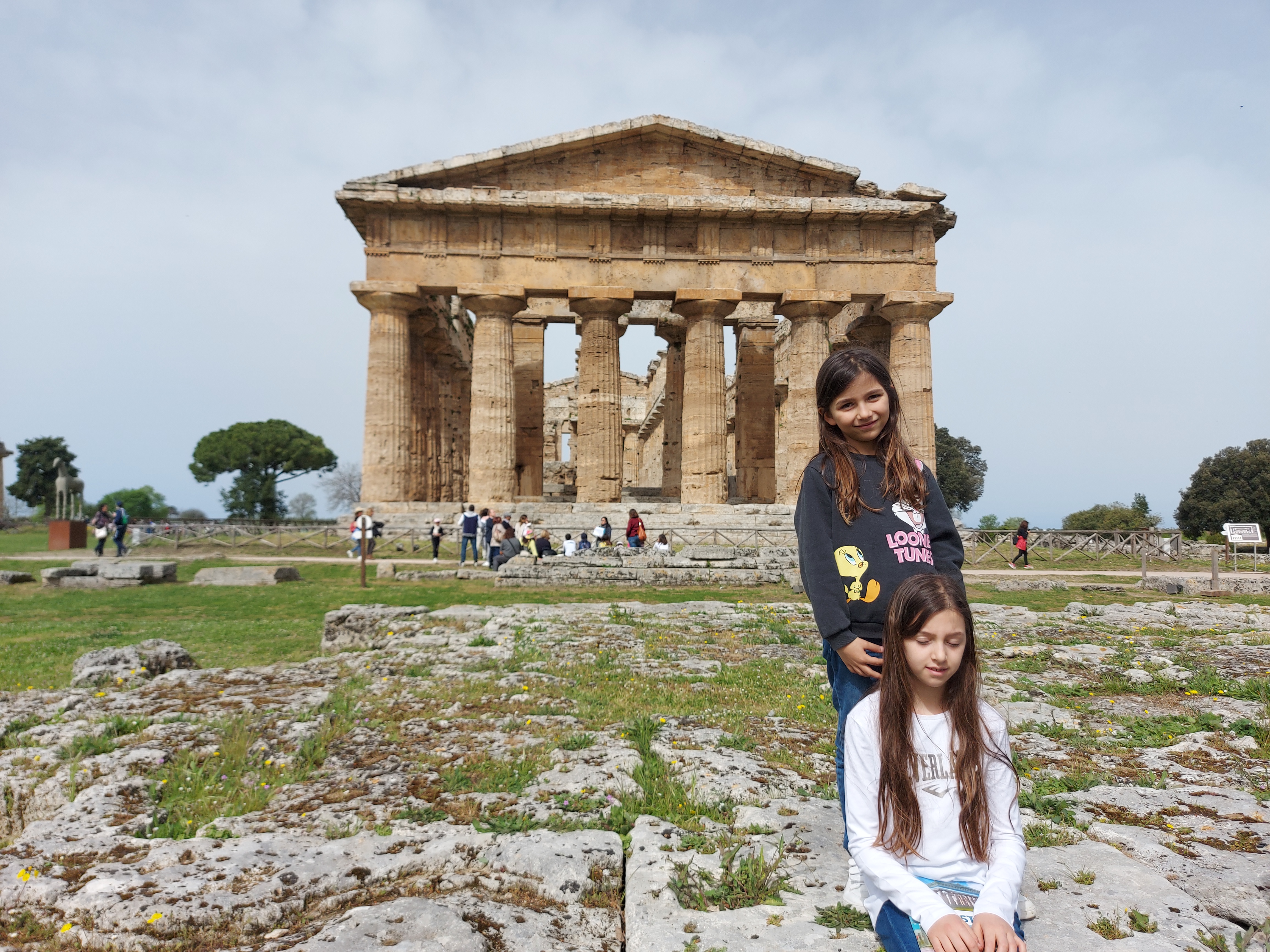 Il templio più grande è il templio di Nettuno, datato V secolo a.C., costruito senza l’utilizzo della malta e con grandi massi collegati tra loro con dei tasselli, l’altro è il tempio di Hera, più piccolo ma più antico, datato 560 a.C., chiamato anche Basilica per il suo colonnato.