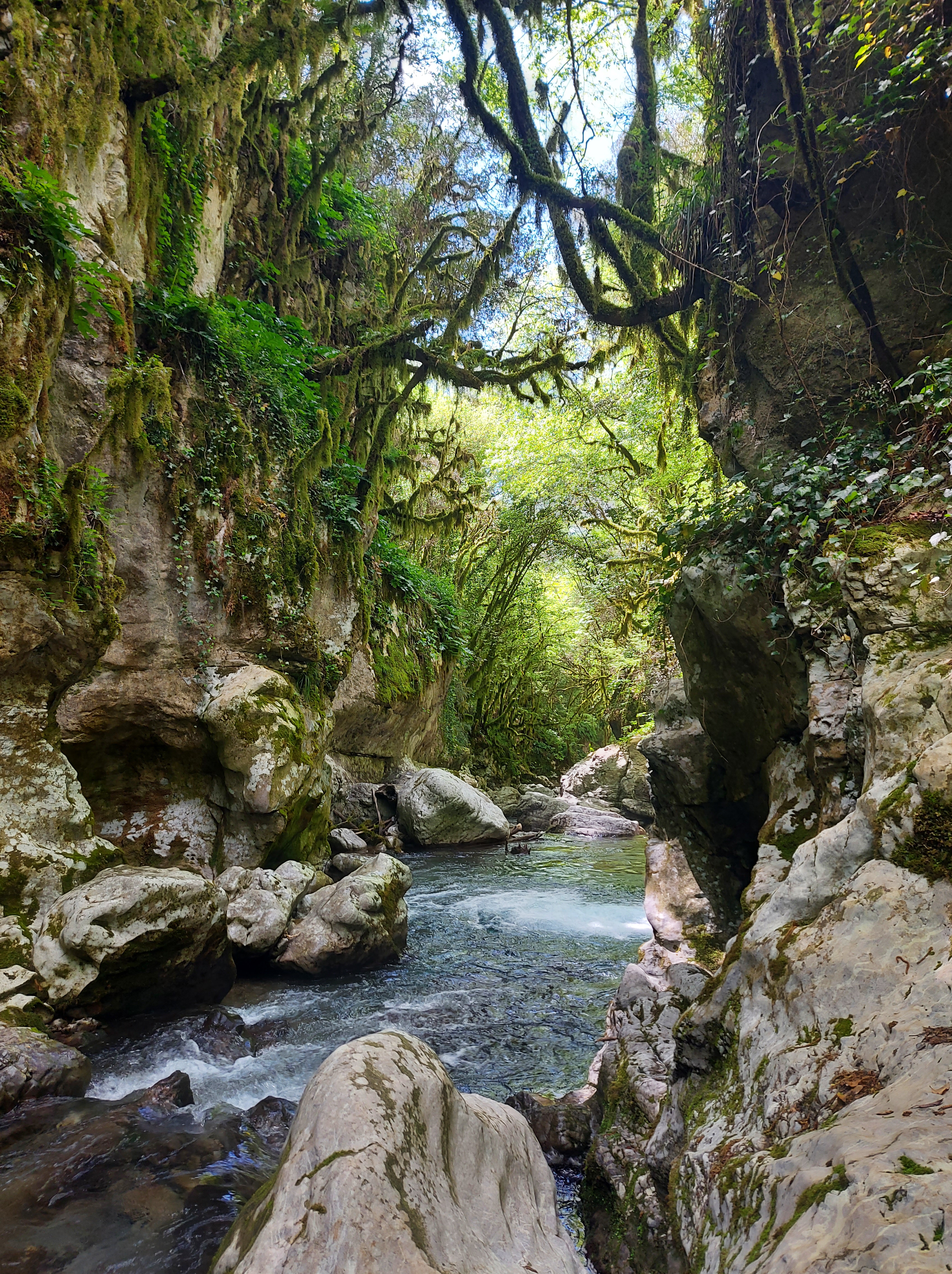 Raggiunta una scalinata che scende ripida, si apre l’incanto: un canyon rivestito da lussureggiante vegetazione, un ruscello dalle acque cristalline, sorgenti, cascate e un antico mulino.