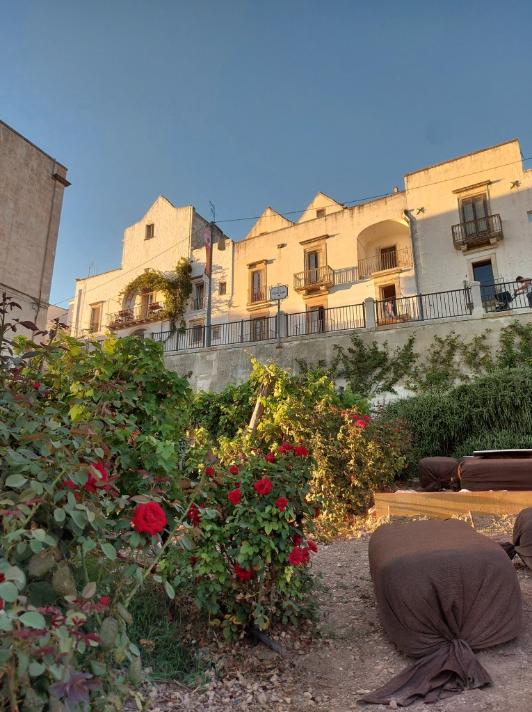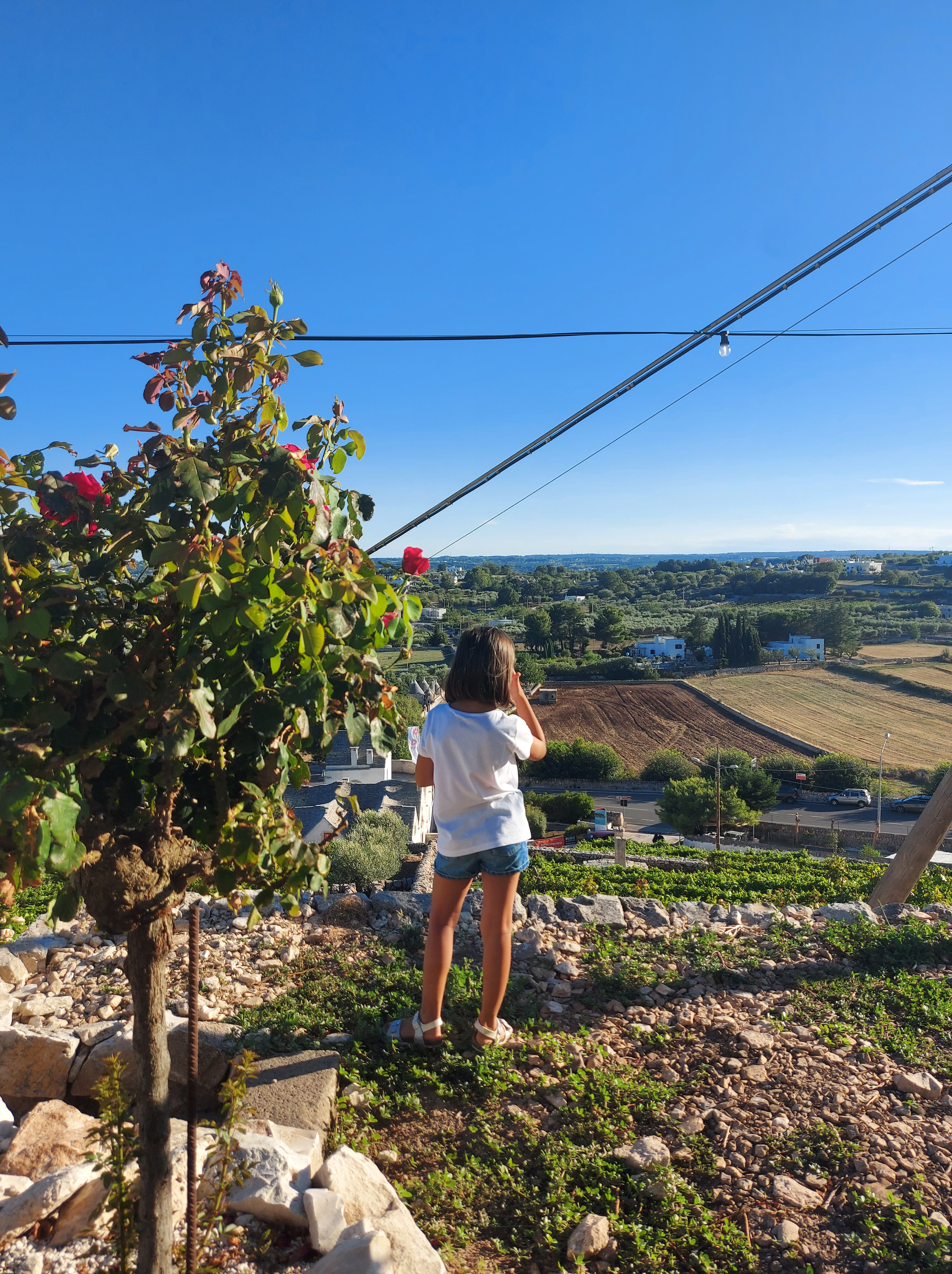 La vista sulla valle D’Itria è pazzesca e tutt’intorno rose dai vari colori, dal rosa più pallido al rosso più acceso.