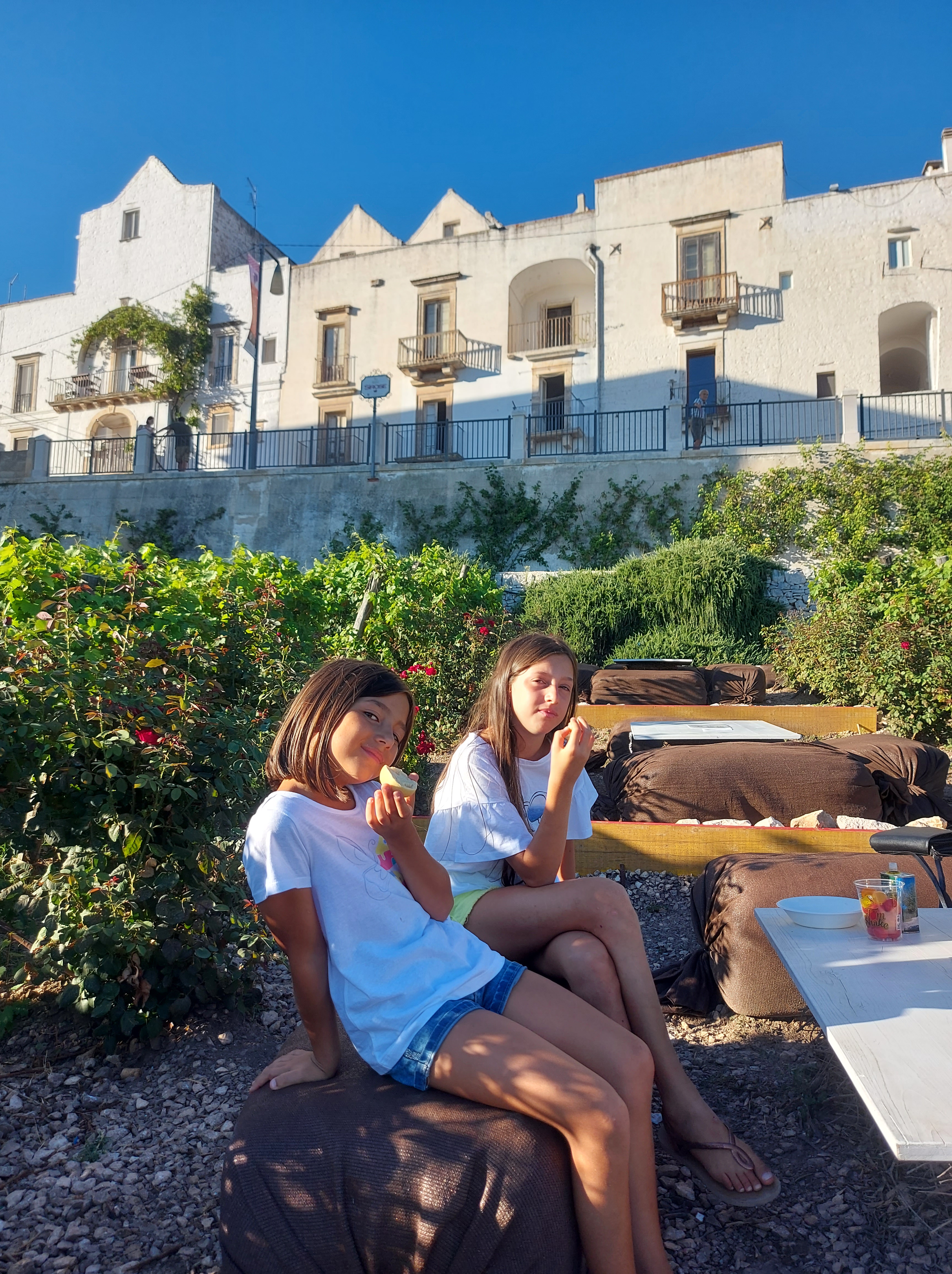 Al tramonto ci siamo immerse nella suggestiva atmosfera del vigneto Sirose, con i suoi terrazzamenti che abbracciano il borgo di Locorotondo. Nella “sporta”: pomodorini, bruschette e olio d’oliva e abbiamo cenato nella zona a noi riservata.