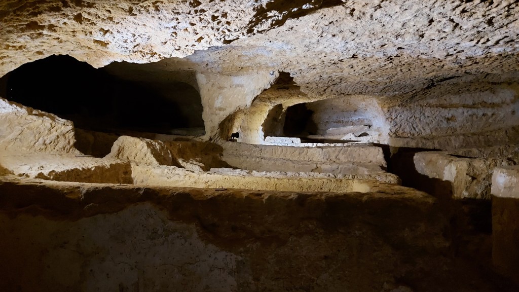 Le grotte funerarie riutilizzano in alcuni casi le cisterne di epoca greca che conservavano l’acqua e i cereali. Alcuni spazi erano impiegati per il rituale funerario collettivo del pasto funebre (refrigerium) consumato dai parenti in occasione della deposizione o della commemorazione dei defunti.