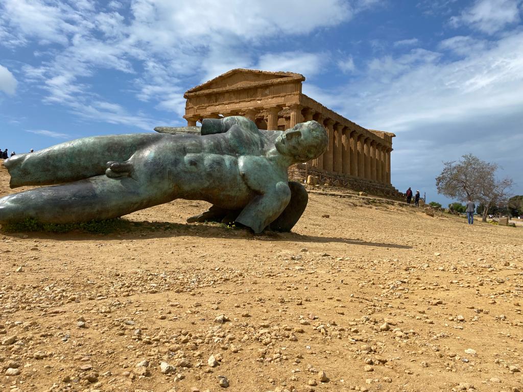 Di fronte a lui giace la scultura di Icaro Caduto, realizzata dallo scultore polacco Igor Mitoraj. La statua rappresenta la caduta di Icaro che, non ascoltando le raccomandazioni del padre Dedalo, volò troppo vicino al Sole, bruciandosi così le sue ali di cera e precipitando nel Mediterraneo.