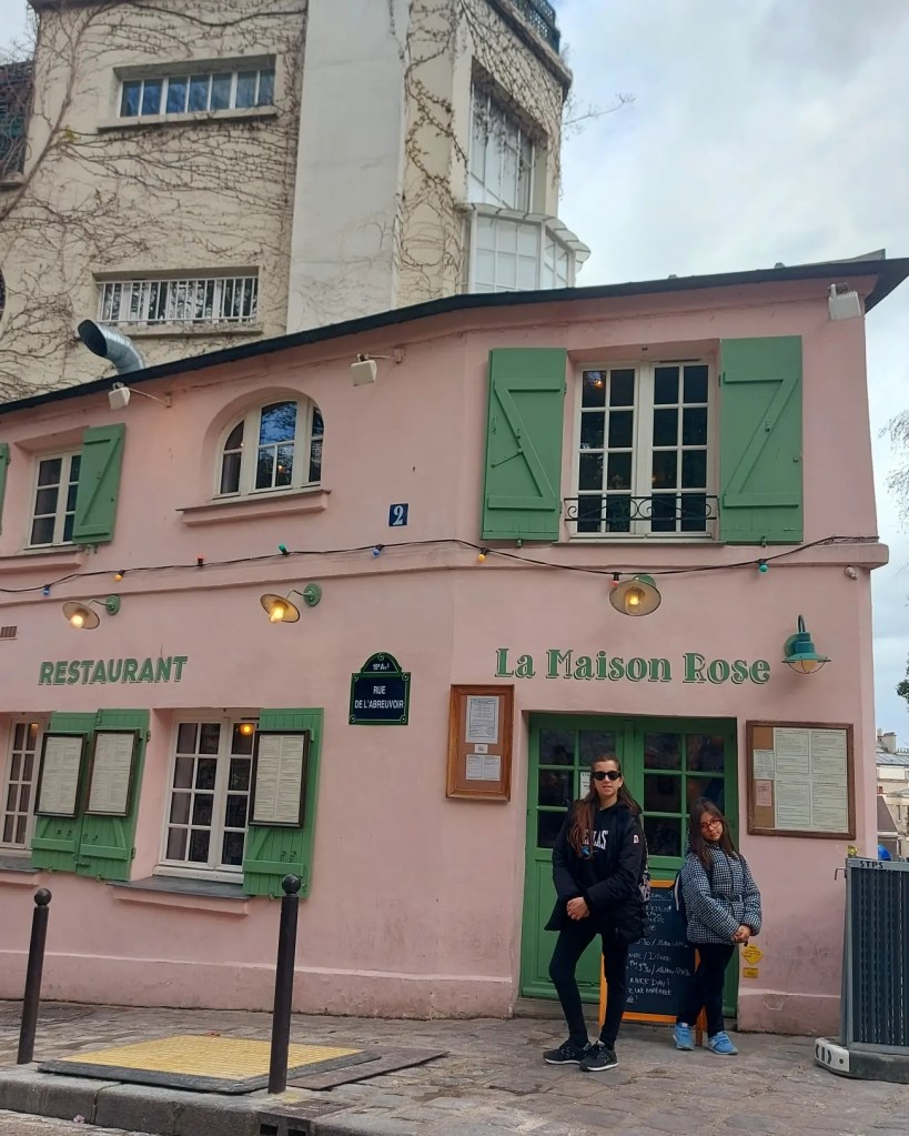 Dalla galleria si intravede uno degli scorci più famosi del quartiere: la celebre Maison Rose. È un luogo iconico a Montmartre, un bistrot rosa dalle persiane verdi.