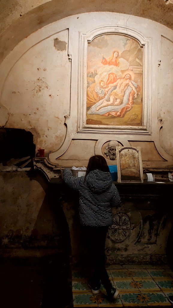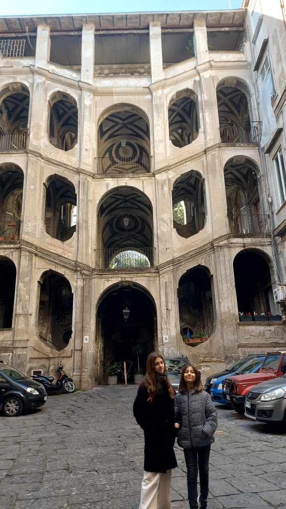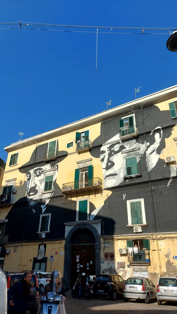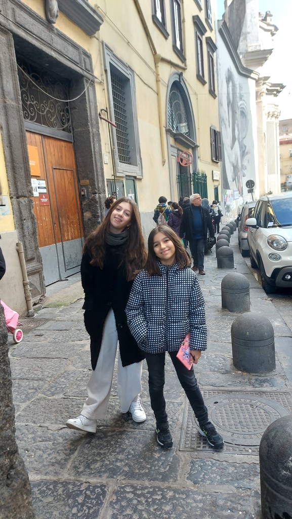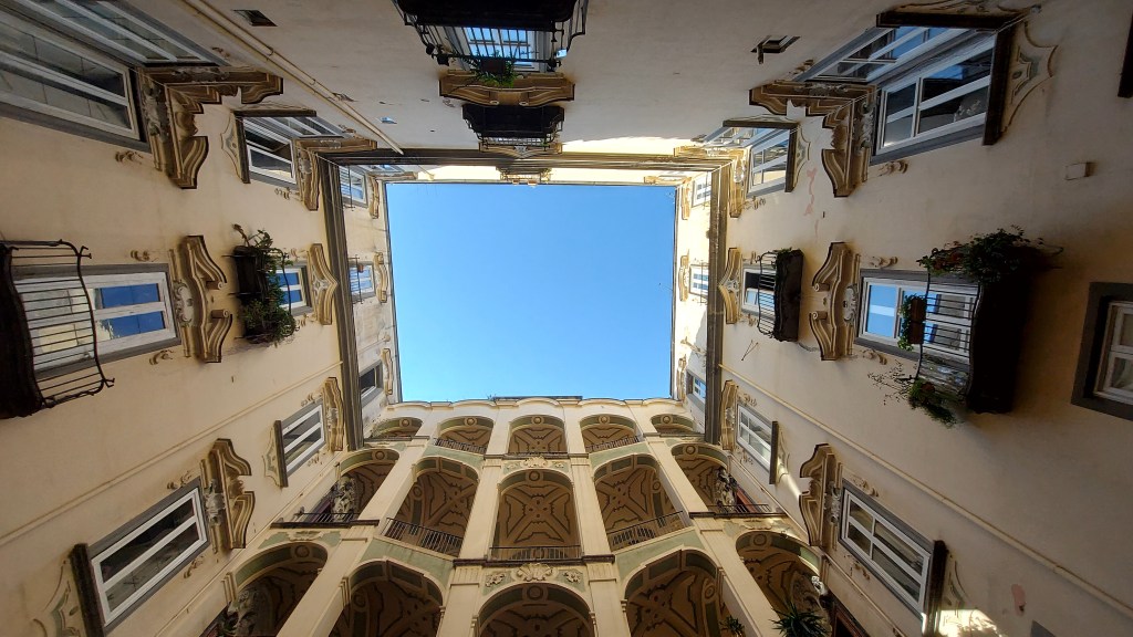 Finito il tour sotterraneo siamo riemersi in uno spazio caotico, con una moltitudine di voci difficili da distinguere, motorini sfreccianti e musica ad alto volume proveniente da una palazzina sopra il nostro naso, dove tre bambine ed un cane si affacciavano al balcone in canotta, improvvisando balletti con il piumino della polvere. Napole è un bel caos.