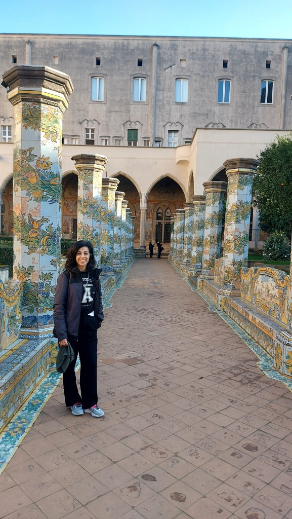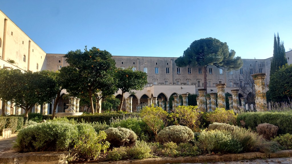 Nel pomeriggio ci siamo dirette al Monastero di Santa Chiara, risalente al 1310, voluto dal re Roberto d’Angiò e sua moglie. Probabilmente fu proprio sua moglie che decise di realizzare questa piccola cittadella francescana, forse per rendere omaggio al suo desiderio represso di vita monastica. Tra i pittori che affrescarono la Basilica annessa al Monastero, Roberto D’Angiò chiamò anche Giotto. Purtroppo del passaggio di Giotto a Napoli, in Santa Chiara, restano solo piccoli frammenti.