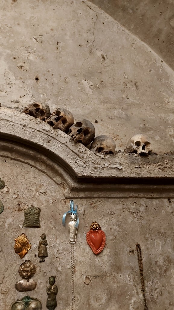 All’interno dell’Ipogeo è possibile notare una capuzzella davvero molto particolare rispetto alle altre: un teschio che sembra avere le orecchie e per questo motivo considerato speciale rispetto agli altri in quanto più “ricettivo” alle preghiere, da qui “Chiesa del teschio con le orecchie”.