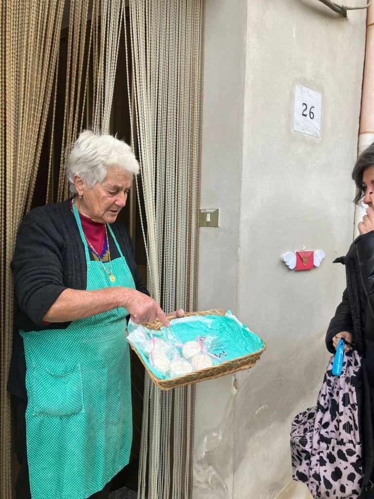 E’ domenica e le vie sono abitate da un silenzio surreale. Girovagando per il borgo, incontriamo la signora che realizza saponette con l’olio d’oliva. Racconta con nostalgia, di un tempo che fu, di un paese autosufficiente con l’allevamento e la macellazione del bestiame.