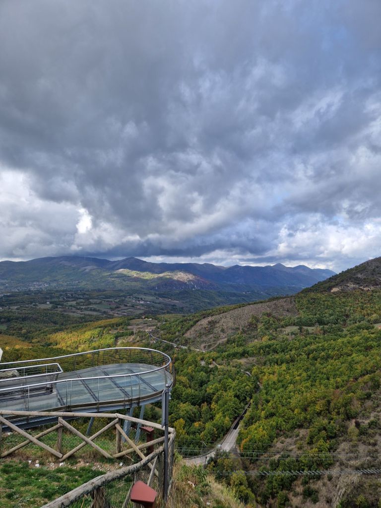 La nostra domenica è stata particolarmente fredda, con un fortissimo maestrale pronto ad avvolgerti in una folata, appena lasciavamo la parete di roccia che avevamo a protezione. Il “ponte della Luna” era chiuso, mentre sul ponte più piccolo vi erano alcuni avventurieri, che fluttuavano letteralmente in aria. Intorno a noi il paesaggio meraviglioso della Val d’Agri e sotto di noi 102 metri di vuoto e natura, visibili dalla terrazza sky-walk in vetro.