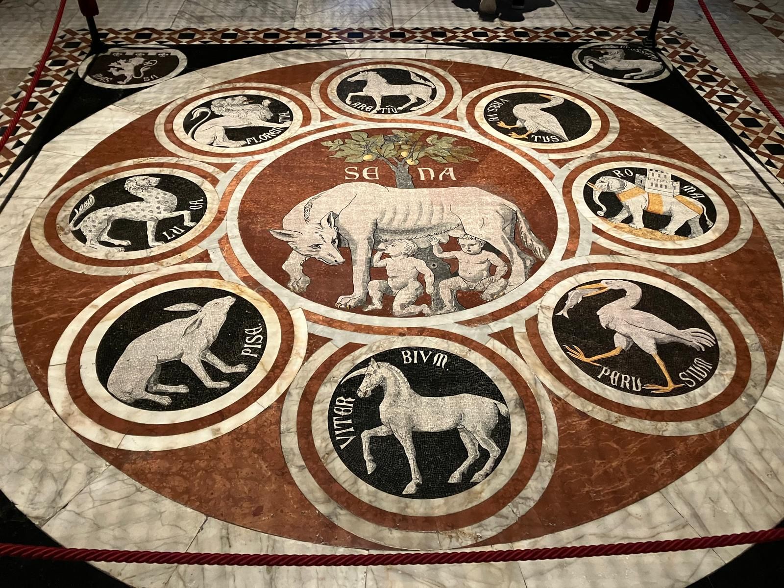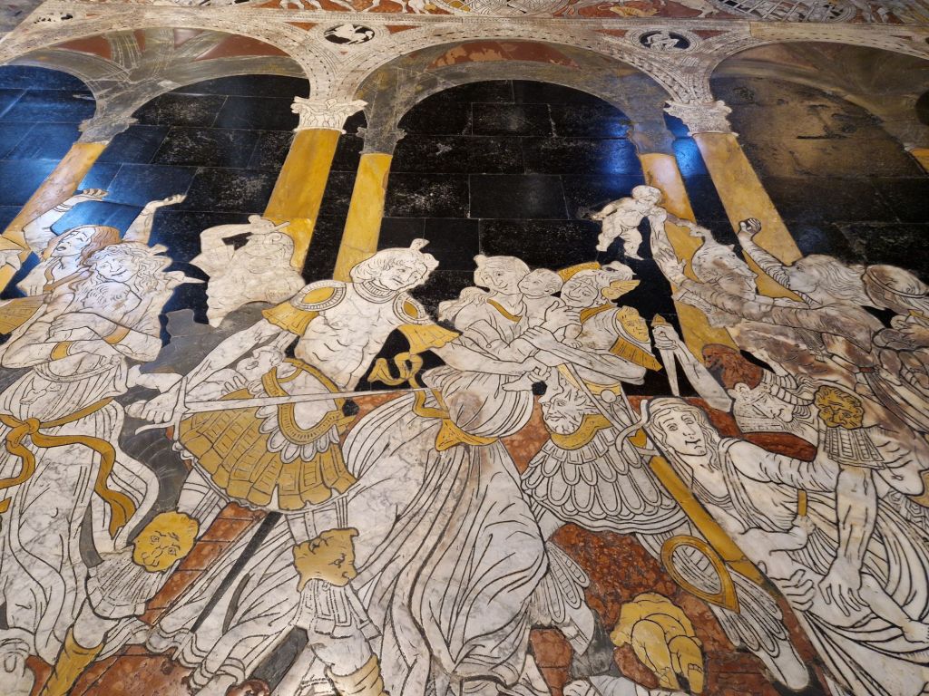 Da piazza del Campo, in pochi minuti raggiungiamo il famosissimo Duomo di Siena, costruito completamente in marmo bianco e verde, ma ciò che ci sorprende sono i suoi interni: soffitti blu e oro che sembrano stellati, imponenti colonne, sculture, affreschi e un pavimento considerato una vera e propria opera d’arte, con ben 56 riquadri, opera di oltre quaranta artisti.