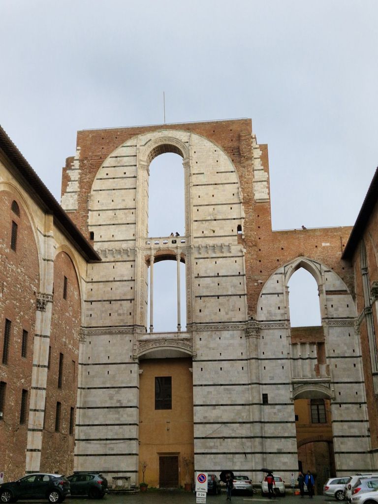 Il Duomo di Siena, secondo il progetto iniziale, doveva essere ancora più grande, infatti nel 1339, nel momento di massimo splendore della città toscana, quando questa rivaleggiava con Firenze, le autorità decisero l’ampliamento, ma un’epidemia di peste bloccò i lavori, lasciando edificato il prolungamento del transetto e la facciata del Duomo Nuovo. Oggi questa facciata è chiamata affettuosamente dai senesi “il Facciatone“.